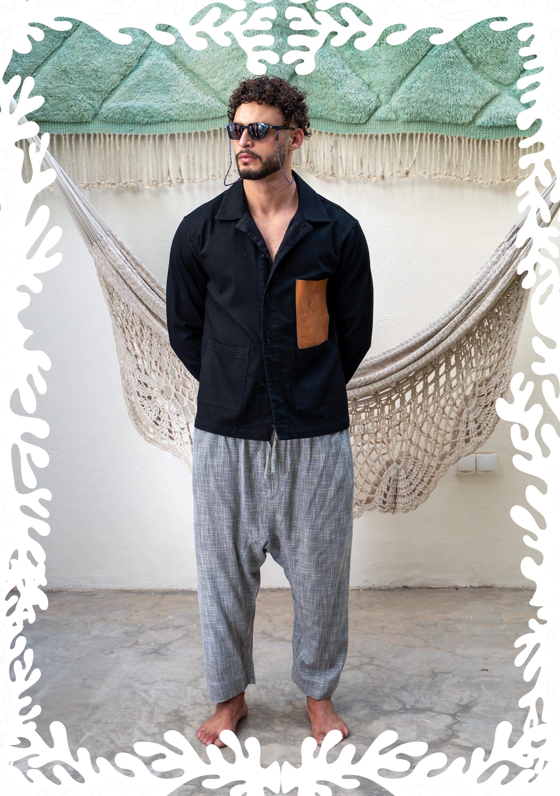A large engraved leather pocket, inspired by the Moro universe, adds a distinctive artistic touch.