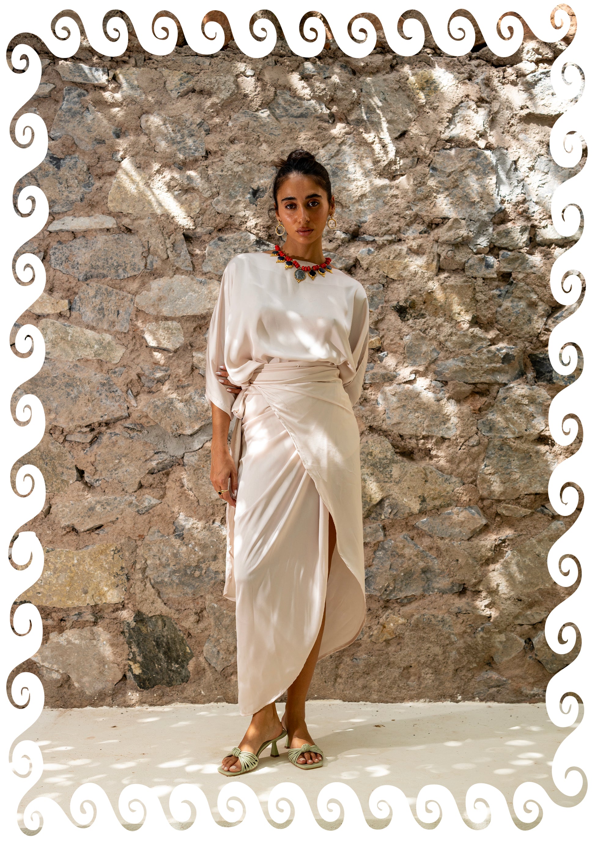 A single sweep of silk satin, this Saharan-inspired dress transforms with every mood—fluid, sculptural, and endlessly modern.