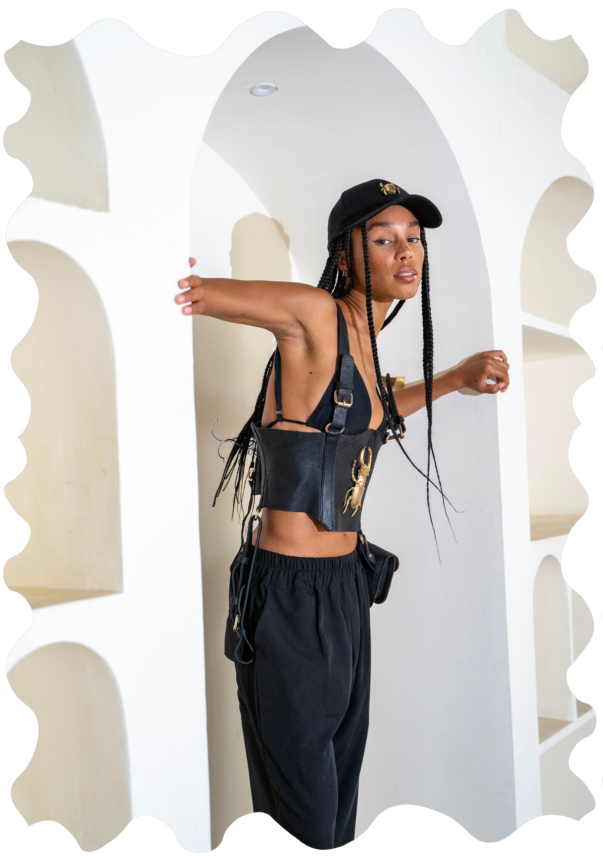 Bold, edgy, and effortlessly chic — this adjustable cow leather bustier features a sleek side pouch and a striking bronze scarab centerpiece.