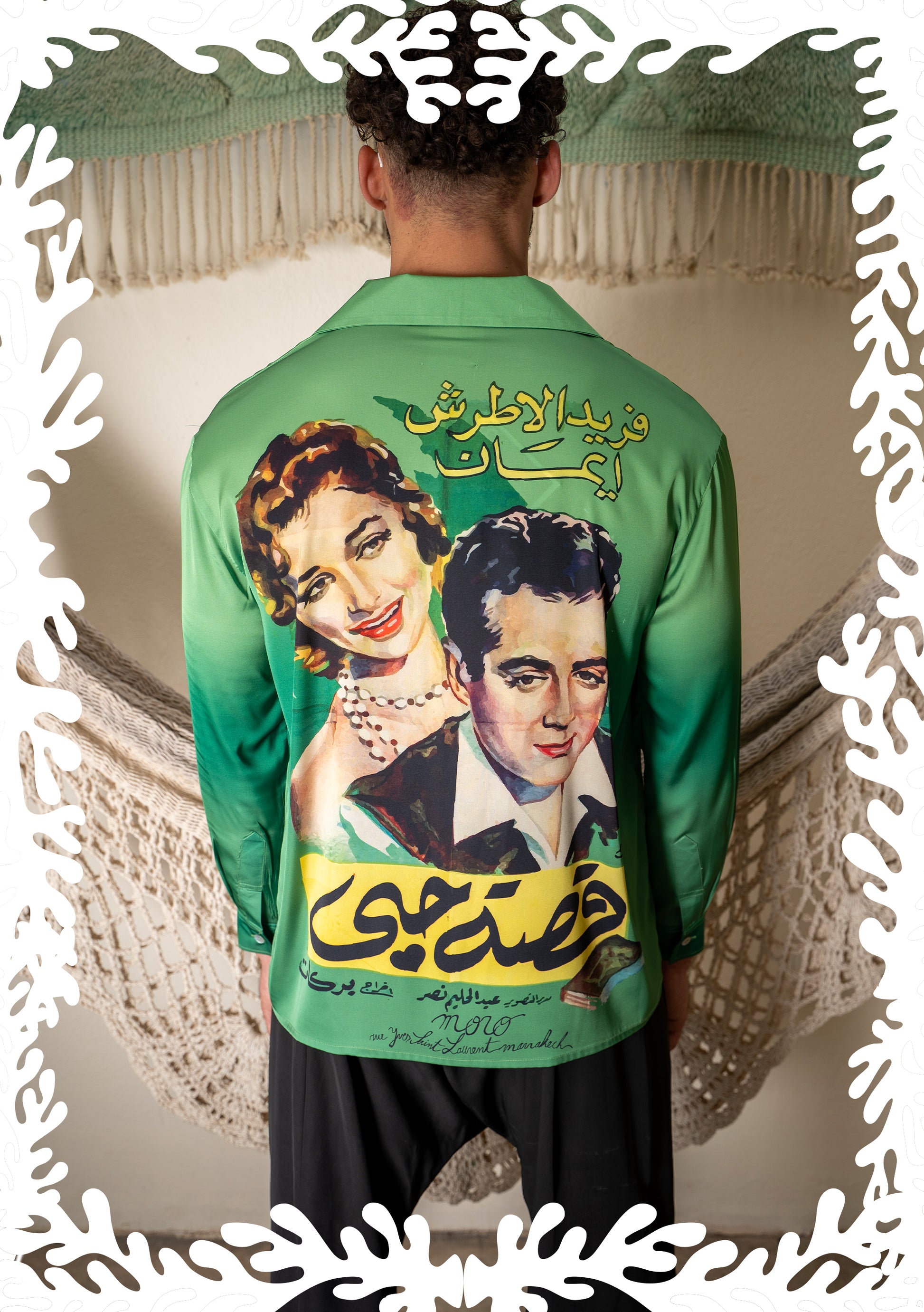 This silk shirt , very confortable to wear features printed motifs inspired by Egyptian movie posters that shaped the Arab artistic scene in the 1980s.